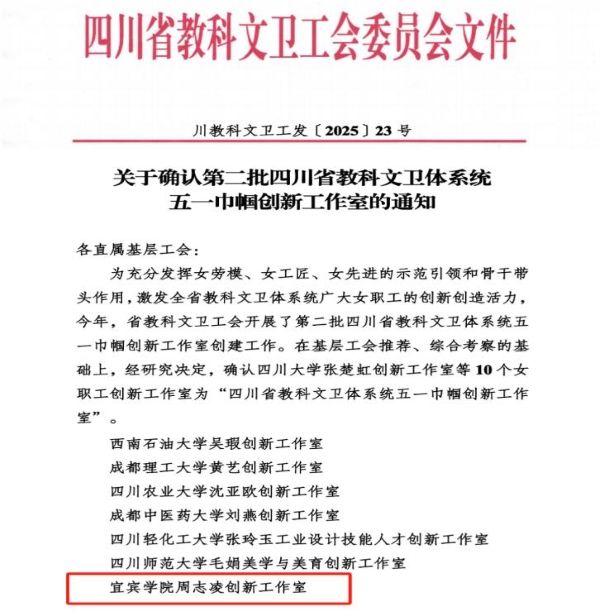 近日,四川省教科文卫工会正式发布《关于公布第二批四川省教科文卫体系统五一巾帼创新工作室名单的通知》,伟德BETVLCTOR1946周志凌创新工作室成功入选四川省教科文卫体系统五一巾帼创新工作室。