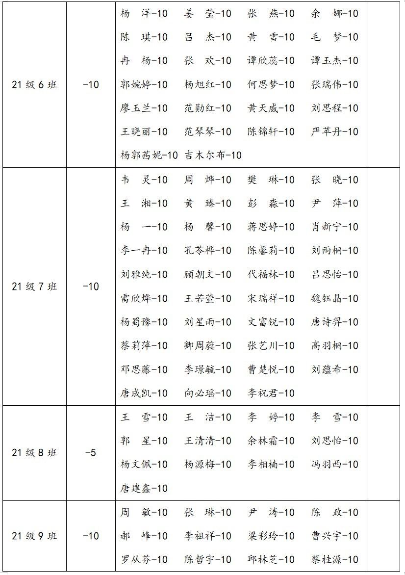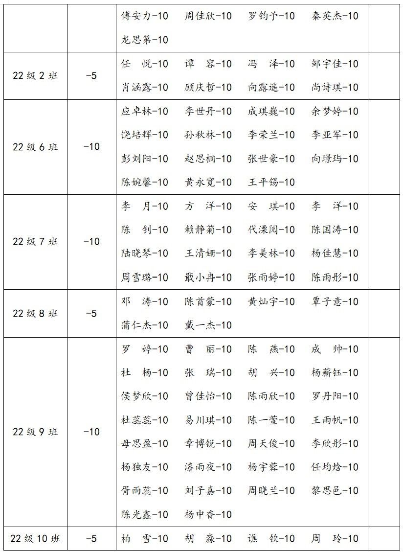 2.在2023-2024学年上学期第四堂团课中,以下同学严重违反团组织生活纪律,情节恶劣;据细则,进行全院通报批评一次,扣除个人操行分10分,并扣除班级量化分5分。