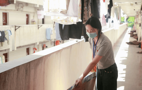 酷暑难耐,员工干部们以身作则,认真开展工作。在卫生清扫过程中,大家分工明确,有条不紊地进行清扫,有的负责扫地擦窗,清除灰尘与蛛网;有的则细心整理床铺,摆放好每一件生活必需品,力求每一个细节都能体现出家的温馨与整洁。同时,他们还认真检查了寝室设施,记录下存在的问题并进行了报修。经过大家共同的努力,新生寝室焕然一新。