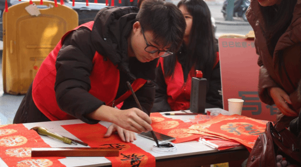 活动现场,bevictor伟德官网的同学大展身手,挥毫泼墨书写春联。一行行俊逸的书法,一句句祝福的话语,寄托着大家对新年的美好期盼。同学们创作的春联不仅饱含着深厚的文化底蕴,更传递出浓浓的新春祝福,居民们纷纷前来欣赏同学们的书法创作,并挑选自己喜爱的春联,现场气氛热烈而温馨。